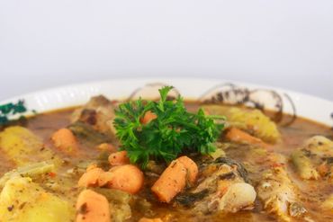 Traditional Haitian stew with mixed vegetables, meat, and dumplings.