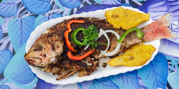 Whole red snapper, seasoned and fried until crispy on the outside, tender inside.